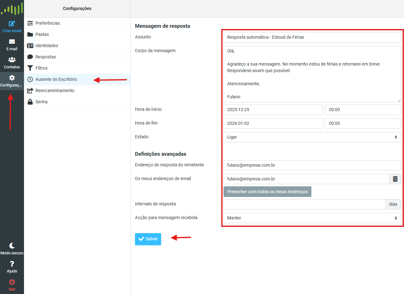 Ao final, clique no botão "Salvar" para criar sua regra de resposta automática. Sua conta de e-mail estará pronta para responder as mensagens recebidas durante o período selecionado.